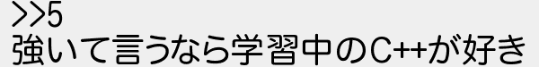 8: [sage] 2023/03/12(日) 14:04:24.93 >>5 強いて言うなら学習中のC++が好き http://medaka.5ch.net/test/read.cgi/prog/1678588889/8