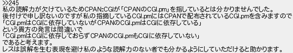 247: [sage] 2008/11/21(金) 16:14:59 ID:??? >>245 私の読解力が欠けているためCPAN::CGIが「CPANのCGI.pm」を指しているとは分かりませんでした。 後付けで申し訳ないのですが私の指摘しているCGI.pmにはCPANで配布されているCGI.pmを含みますので 「CGI.pmはCGIに依存していないがCPANのCGI.pmはCGIに依存している」 という貴方の発言は間違いで 「CGI.pmはCGIに依存しておらずCPANのCGI.pmもCGIに依存していない」 であると考えます。 レスは誤解を生む表現を避け私のような読解力のない者でも分かるようにしていただけると助かります。 http://medaka.5ch.net/test/read.cgi/php/1030548610/247