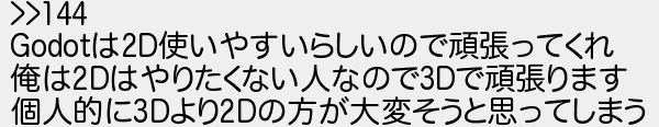 158: [sage] 2023/09/20(水) 18:15:18.44 ID:SPS5ElXG >>144 Godotは2D使いやすいらしいので頑張ってくれ 俺は2Dはやりたくない人なので3Dで頑張ります 個人的に3Dより2Dの方が大変そうと思ってしまう http://mevius.5ch.net/test/read.cgi/gamedev/1695087270/158