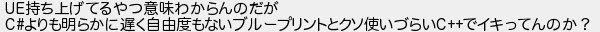 791: [sage] 2023/09/26(火) 19:24:15.99 ID:RYVVf0QK UE持ち上げてるやつ意味わからんのだが C#よりも明らかに遅く自由度もないブループリントとクソ使いづらいC++でイキってんのか? http://mevius.5ch.net/test/read.cgi/gamedev/1695087270/791