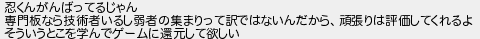 忍くんがんばってるじゃん 専門板なら技術者いるし弱者の集まりって訳ではないんだから頑張りは評価してくれるよ そういうとこを学んでゲームに還元して欲しい