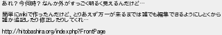 158: 名無しさん@お腹いっぱい。 [sage] 2007/01/14(日) 08:17:22 あれ?今何時?なんか外がすっごく明るく見えるんだけど… 簡単にwikiで作ったんだけど、とりあえず万一が来るまでは誰でも編集できるようにしとくから 誰か追記したり修正したりしてくれ… http://hitobashira.org/index.php?FrontPage http://mevius.5ch.net/test/read.cgi/unix/1168658045/158