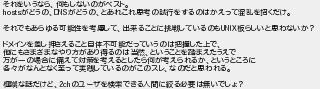 305: 名無しさん@お腹いっぱい。 [sage] 2007/01/17(水) 07:06:39 それをいうなら、何もしないのがベスト。 hostsがどうの、DNSがどうの、とあれこれ思考の試行をするのはかえって混乱を招くだけ。 それでもあらゆる可能性を考慮して、出来ることに挑戦しているのもUNIX板らしいと思わないか? ドメインを差し押さえること自体不可能だっていうのは把握した上で、 他にもさまざまなやり方があり得るのは当然、ということを踏まえたうえで 万が一の場合に備えて対策を考えるとしたら何が考えられるか、というところに 各々がなんとなく至って実践しているのがこのスレ、なのだと思われる。 極端な話だけど、2chのユーザを検索できる人間に絞る必要は無いでしょ? http://mevius.5ch.net/test/read.cgi/unix/1168658045/305