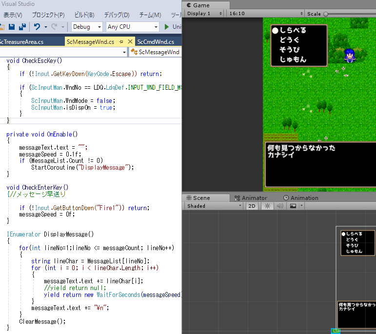 さてさて、メッセージに一文字づつの表示とボタン押して一気に表示を実装した!