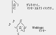 56: [] 02/12/09 21:49 ID:+fcVsjip | \ |Д`) ダレモイナイ... |⊂ マンセースルナラ イマノウチ... | ♪ ∬ ♪ / \ ヽ(´Д`;)ノ Weblogic ( へ) マンセー く http://medaka.5ch.net/test/read.cgi/php/1036002877/56