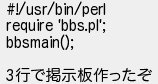 238: [sage] 04/02/01 15:24 ID:??? #!/usr/bin/perl require 'bbs.pl'; bbsmain(); 3行で掲示板作ったぞ http://medaka.5ch.net/test/read.cgi/php/1036141603/238