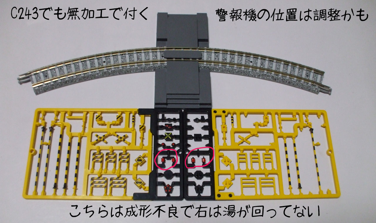 いやいや、成形不良でパーツのカタチをなしてない。「部品の選択で第1、3、4種踏切のいずれかを組み立て可能⋯2種類の踏切警報灯⋯」が成立してない。