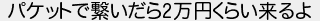 324: [sage] 2007/01/20(土) 16:34:48 パケットで繋いだら2万円くらい来るよ http://mevius.5ch.net/test/read.cgi/unix/1168658045/324