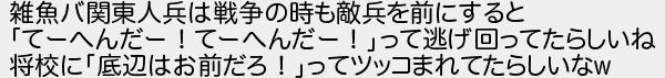 雑魚バ関東人兵は戦争の時も敵兵を前にすると てーへんだー!てーへんだー!って逃げ回ってたらしいね 将校に底辺はお前だろ!ってツッコまれてたらしいな