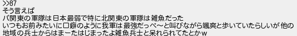 そう言えば バ関東の軍隊は日本最弱で特に北関東の軍隊は雑魚だった いつもお前みたいに口癖のように我軍は最強だっぺと叫びながら爽と歩いていたらしいが他の 地域の兵士からはまーたはじまったよ雑魚兵士と呆れられてたとか
