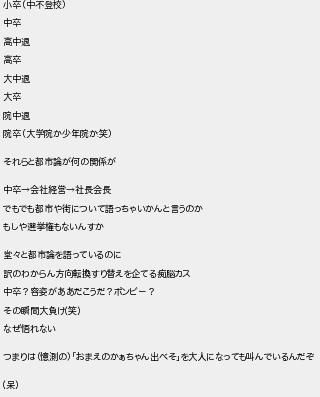 小卒中不登校 中卒 高中退 高卒 大中退 大卒 院中退 院卒大学院か少年院か笑 それらと都市論が何の関係が 中卒会社経営社長会長 でもでも都市や街について語っちゃいかんと言うのか もしや選挙権もないんすか 堂と都市論を語っているのに 訳のわからん方向転換すり替えを企てる痴脳カス 中卒?容姿がああだこうだ?ボンビー? その瞬間大負け笑 なぜ悟れない つまりは憶測のおまえのかぁちゃん出べそを大人になっても叫んでいるんだぞ 呆