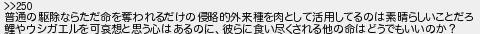 259: (ベーイモ MM83-hoPX) [sage] 2025/08/03(日) 15:34:38.20 ID:M >>250 普通の駆除ならただ命を奪われるだけの侵略的外来種を肉として活用してるのは素晴らしいことだろ 鯉やウシガエルを可哀想と思う心はあるのに、彼らに食い尽くされる他の命はどうでもいいのか? http://egg.5ch.net/test/read.cgi/streaming/1753698529/259