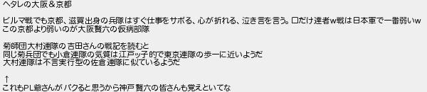 ヘタレの大阪京都 ビルマ戦でも京都滋賀出身の兵隊はすぐ仕事をサボる心が折れる泣き言を言う口だけ達者戦は日本軍で一番弱い この京都より弱いのが大阪六の仮病部隊 菊師団大村連隊の吉田さんの戦記を読むと 同じ菊兵団でも小倉連隊の気質は江戸ッ子的で東京連隊の歩一に近いようだ 大村連隊は不言実行型の佐倉連隊に似ているようだ これも爺さんがパクると思うから神戸六の皆さんも覚えといてな