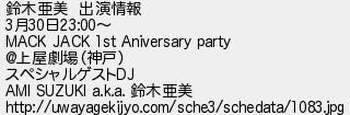 46: [] 2013/03/28(木) 01:27:58.03 鈴木亜美 出演情報 3月30日23:00〜 MACK JACK 1st Aniversary party @上屋劇場(神戸) スペシャルゲストDJ AMI SUZUKI a.k.a. 鈴木亜美 http://uwayagekijyo.com/sche3/schedata/1083.jpg http://egg.5ch.net/test/read.cgi/ami/1320817841/46