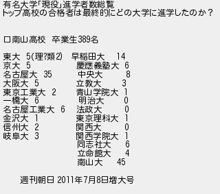 有名大学現役進学者数総覧 トップ高校の合格者は最終的にどの大学に進学したのか? 南山高校 卒業生名 東大 理類 早稲田大 京大 慶義塾大 名古屋大 中央大 大阪大 立教大 東京工業大 青山学院大 一橋大 明治大 名古屋工業大 法政大 金沢大 東京理科大 信州大 関西大 岐阜大 関西学院大 同志社大 立命館大 南山大 週刊朝日 年月日増大号