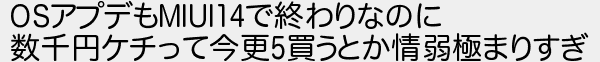471: (アウアウウー Sac7-dh2Z) [sage] 2023/08/15(火) 19:38:02.03 ID:GPiZCcPxa OSアプデもMIUI14で終わりなのに 数千円ケチって今更5買うとか情弱極まりすぎ http://egg.5ch.io/test/read.cgi/android/1663291810/471