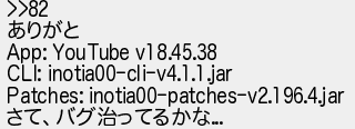 85: (ワッチョイ 7fc4-Dyi9) [sage] 2023/11/16(木) 21:55:34.28 ID:WI63z0i30 >>82 ありがと App: YouTube v18.45.38 CLI: inotia00-cli-v4.1.1.jar Patches: inotia00-patches-v2.196.4.jar さて、バグ治ってるかな... http://egg.5ch.net/test/read.cgi/android/1699634708/85