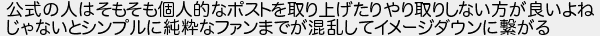 公式の人はそもそも個人的なポストを取り上げたりやり取りしない方が良いよね じゃないとシンプルに純粋なファンまでが混乱してイメージダウンに繋がる