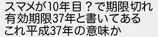 391: 388 [sage] 2025/08/25(月) 20:00:44.60 スマメが10年目?で期限切れ 有効期限37年と書いてある これ平成37年の意味か http://egg.5ch.net/test/read.cgi/atom/1663644331/391