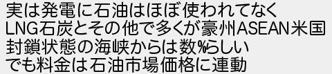 実は発電に石油はほぼ使われてなく 石炭とその他で多くが豪州米国 封鎖状態の海峡からは数らしい でも料金は石油市場価格に連動
