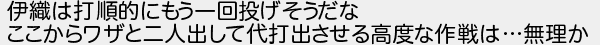 伊織は打順的にもう一回投げそうだな ここからワザと二人出して代打出させる高度な作戦は無理か