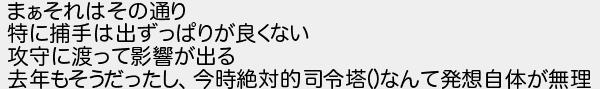 まぁそれはその通り 特に捕手は出ずっぱりが良くない 攻守に渡って影響が出る 去年もそうだったし今時絶対的司令塔なんて発想自体が無理