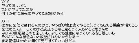 やって欲しいね フジがやってたのか 何年か前に深夜にやってた記憶がある 確かに配信で見れるんだけどやっぱり地上波でやると知ってもらえる機会が増えるし 配信だとスルーしてたけど放送するなら見るって人もいると思うんだ ネットの反応見るのも楽しいし少しでも話題になってくれるなら嬉しいし それにこんな機会ないと放送されないからなあ まあ配信はとか無くて見やすくていいけどね