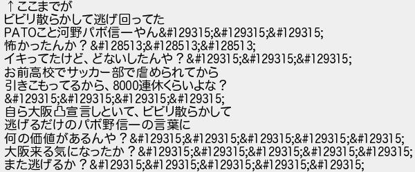 ここまでが ビビリ散らかして逃げ回ってた こと河野パボ信一やん 怖かったんか? イキってたけどどないしたんや? お前高校でサッカー部で虐められてから 引きこもってるから連休くらいよな? 自ら大阪凸宣言しといてビビリ散らかして 逃げるだけのパボ野信一の言葉に 何の価値があるんや? 大阪来る気になったか? また逃げるか?
