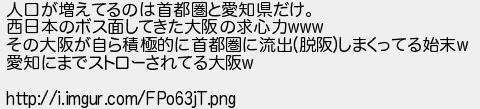 653: (やわらか銀行) [] 2017/11/03(金) 22:44:10 ID:GfQeSwq6 人口が増えてるのは首都圏と愛知県だけ。 西日本のボス面してきた大阪の求心力www その大阪が自ら積極的に首都圏に流出(脱阪)しまくってる始末w 愛知にまでストローされてる大阪w http://i.imgur.com/FPo63jT.png http://egg.5ch.net/test/read.cgi/develop/1424467882/653