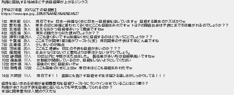 411: (空) [] 2016/12/20(火) 20:53:37.05 ID:GuRJLIRG 所得に固執する地域ほど子供自殺率が上がるジンクス 【平成27年度 20代以下の自殺数】 https://www.npa.go.j...E8%87%AA%E6%AE%BA%27 1位 東京都 63人 流石ですw 日本一裕福なくせに日本一自殺者を出していますw 自殺する弱虫のクズばかりw 2位 愛知県 35人 東京の次に裕福と言われてるくせにここも自殺まみれですw トヨタの階級社会は子供にまで引き継がれるのでしょうか?? 3位 北海道 34人 貧乏なおかつ自殺者多いって最低ですねw 4位 埼玉県 30人 東京の隣だから似た傾向でしょうか?? 5位 神奈川県29人 ここも凄く多いですw裕福なくせに自殺するのはどういうことでしょうか?? 5位 千葉県 29人 ここまでが関東1都3県がワースト5(笑) 流石関東の子供は不幸どん底ですね 7位 兵庫県 27人 少し多いのが難点 8位 茨城県 20人 ここも工場街w 日立の子供も自殺が多いのか??? 9位 福岡県 19人 まあ少なくはないけど愛知よりは率は少ない分マシでしょう。 10位 静岡県 17人 10位以内に中部がまた出ました。 製造業が多い所は自殺率高いですねw 10位 福島県 17人 放射能が関係しているのか、自殺をしないようにしてください 12位 栃木県 14人 田舎のくせに自殺多いぞw 13位 群馬県 12位 ここも田舎のくせに上位w 東日本はどこも自殺まみれだぞw 14位 大阪府 11人 流石です!! 貧困にも負けず自殺せず生き延びる逞しさがしっかりしてる!!! 経済を追い求める姿勢が首都圏愛知を自殺ワースト5にランクインさせていることはどう思う? 所得が多ければ子供を自殺に追い込んでも平気な顔してられるのか? 本当に関東愛知は人間のクズだな http://egg.5ch.net/test/read.cgi/develop/1474061721/411