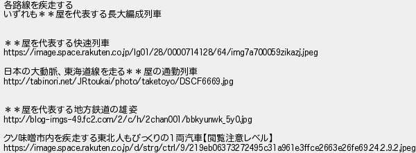 653: (catv?) [] 2017/06/10(土) 19:41:27.30 ID:4E0m7Teb 各路線を疾走する いずれも**屋を代表する長大編成列車 **屋を代表する快速列車 https://image.space.rakuten.co.jp/lg01/28/0000714128/64/img7a700059zikazj.jpeg 日本の大動脈、東海道線を走る**屋の通勤列車 http://tabinori.net/JRtoukai/photo/taketoyo/DSCF6669.jpg **屋を代表する地方鉄道の雄姿 http://blog-imgs-49.fc2.com/2/c/h/2chan001/bbkyunwk_5y0.jpg クソ味噌市内を疾走する東北人もびっくりの1両汽車【閲覧注意レベル】 https://image.space.rakuten.co.jp/d/strg/ctrl/9/219eb06373272495c31a961e3ffce2663e26fe69.24.2.9.2.jpeg http://egg.5ch.io/test/read.cgi/develop/1495098496/653