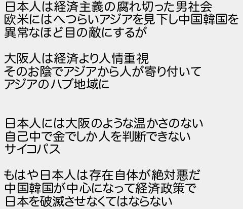 日本人は経済主義の腐れ切った男社会 欧米にはへつらいアジアを見下し中国韓国を 異常なほど目の敵にするが 大阪人は経済より人情重視 そのお陰でアジアから人が寄り付いて アジアのハブ地域に 日本人には大阪のような温かさのない 自己中で金でしか人を判断できない サイコパス もはや日本人は存在自体が絶対悪だ 中国韓国が中心になって経済政策で 日本を破滅させなくてはならない