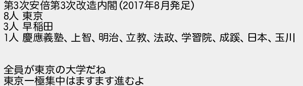 第次安倍第次改造内閣年月発足 人 東京 人 早稲田 人 慶義塾上智明治立教法政学習院成日本玉川 全員が東京の大学だね 東京一極集中はますます進むよ