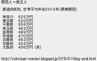 関西人貧乏人 都道府県別世帯平均年収2013年関東関西 神奈川 525万円 東京都 520万円 千葉県 504万円 埼玉県 493万円 滋賀県 489万円 茨城県 470万円 兵庫県 463万円 京都府 424万円 大阪府 406万円 笑