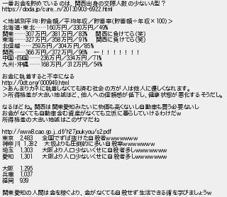 842: (SB-iPhone) [] 2017/08/17(木) 20:29:42.39 ID:CIZMhbbT 一番お金を貯めているのは、関西出身の交際人数の少ないA型? https://doda.jp/care...n/20130903-6922.html <地域別平均:貯金額/平均年収/貯蓄率(貯蓄額÷年収×100)> 北海道・東北……160万円/330万円/49% 関東……307万円/381万円/83% 関西に負けてら(笑) 東海……327万円/358万円/91% 関西に負けてら(笑) 北信越……259万円/304万円/85% 関西……366万円/372万円/96% ←!!!!!!! 中国・四国……236万円/334万円/71% 九州・沖縄……168万円/312万円/54% お金に執着すると不幸になる http://0dt.org/000949.html >あんまりカネに執着しなくても済む社会の方が人は他人に優しくなれます。 >所得格差が大きい地域ほど、他人への信頼感が低下し、健康状態が悪化するそうだし。 なるほどね。関西は関東愛知みたいに物価も高くないし自動車も買う必要ないし お金がなくても自動車含む資産がなくても立派に暮らしていけるわけだw 所得格差の大きい地域はこのザマだね http://www8.cao.go.j...df/h27joukyou/s2.pdf 東京 2,483 全国でずば抜けた自殺者wwwwwww 神奈川 1,382 大坂よりも圧倒的に多い自殺率wwwwwww 埼玉 1,303 大阪より人口少ないくせに自殺者多しwwwwwww 愛知 1,301 大阪より人口少ないくせに自殺者多しwwwwwww 大阪 1,295 兵庫 1,037 福岡 939 関東愛知の人間は金を稼ぐより、金がなくても自殺せず生活できる術を学びましょうw http://egg.5ch.net/test/read.cgi/develop/1501831768/842