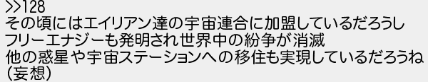 その頃にはエイリアン達の宇宙連合に加盟しているだろうし フリーエナジーも発明され世界中の紛争が消滅 他の惑星や宇宙ステーションへの移住も実現しているだろうね 妄想