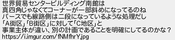534: (東京都) [sage] 2017/09/09(土) 22:11:01.57 ID:Accm3pSl 世界貿易センタービルディング南館は 真四角じゃなくてコーナーが一部斜めになってるのね パースでも線路側は二段になっているような処理だし 「A街区」「B街区」に対して「C地区」と 事業主体が違い、別の計画であることを明確にしてるのかな? https://i.imgur.com/fNMfhrY.jpg http://egg.5ch.net/test/read.cgi/develop/1504101366/534