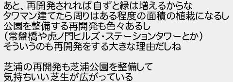 587: (東京都) [sage] 2017/09/10(日) 16:48:30.01 ID:auktd8qN あと、再開発されれば自ずと緑は増えるからな タワマン建てたら周りはある程度の面積の植栽になるし 公園を整備する再開発も色々あるし (常盤橋や虎ノ門ヒルズ・ステーションタワーとか) そういうのも再開発をする大きな理由だしね 芝浦の再開発も芝浦公園を整備して 気持ちいい芝生が広がっている http://egg.5ch.net/test/read.cgi/develop/1504101366/587