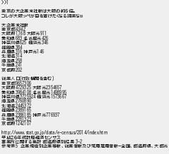 303: (やわらか銀行) [sage] 2018/01/29(月) 19:57:25.27 ID:d64gDZbo >>1 東京の大企業本社数は大阪の約5倍。 コレが大阪ッペが目を背けたくなる現実なw 大企業本社数 東京都4,942 大阪府1,168 大阪市911 愛知県683 名古屋市426 神奈川県625 横浜市346 福岡県384 兵庫県316 神戸市146 北海道314 埼玉県258 千葉県241 京都府202 従業人口(行政機関を含む) 東京都9657306 大阪府4729325 大阪市2354657 愛知県3984108 名古屋市1498995 神奈川県3725924 横浜市1573667 埼玉県2760890 北海道2445372 福岡県2389165 兵庫県2386185 神戸市776937 千葉県2281323 京都府1242107 http://www.stat.go.jp/data/e-census/2014/index.htm 平成26年統計局経済センサス 事業所に関する集計 都道府県別結果 3-2 参考表5 企業規模別企業等数、従業者数及び常用雇用者数−全国、都道府県、大都市 http://egg.5ch.io/test/read.cgi/develop/1512910721/303