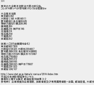 303: (やわらか銀行) [sage] 2018/01/29(月) 19:57:25.27 ID:d64gDZbo >>1 東京の大企業本社数は大阪の約5倍。 コレが大阪ッペが目を背けたくなる現実なw 大企業本社数 東京都4,942 大阪府1,168 大阪市911 愛知県683 名古屋市426 神奈川県625 横浜市346 福岡県384 兵庫県316 神戸市146 北海道314 埼玉県258 千葉県241 京都府202 従業人口(行政機関を含む) 東京都9657306 大阪府4729325 大阪市2354657 愛知県3984108 名古屋市1498995 神奈川県3725924 横浜市1573667 埼玉県2760890 北海道2445372 福岡県2389165 兵庫県2386185 神戸市776937 千葉県2281323 京都府1242107 http://www.stat.go.jp/data/e-census/2014/index.htm 平成26年統計局経済センサス 事業所に関する集計 都道府県別結果 3-2 参考表5 企業規模別企業等数、従業者数及び常用雇用者数−全国、都道府県、大都市 http://egg.5ch.io/test/read.cgi/develop/1512910721/303