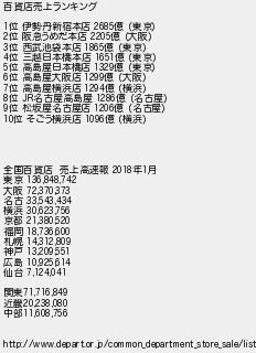 百貨店売上ランキング 位 伊勢丹新宿本店 億 東京 位 阪急うめだ本店 億 大阪 位 西武池袋本店 億 東京 位 三越日本橋本店 億 東京 位 高島屋日本橋店 億 東京 位 高島屋大阪店 億 大阪 位 高島屋横浜店 億 横浜 位 名古屋高島屋 億 名古屋 位 松坂屋名古屋店 億 名古屋 位 そごう横浜店 億 横浜 全国百貨店 売上高速報 年月 東京 大阪 名古 横浜 京都 福岡 札幌 神戸 広島 仙台 関東 近畿 中部