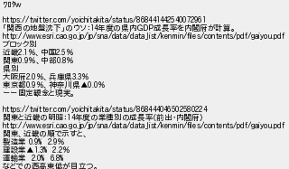 45: (空) [] 2017/12/16(土) 13:04:36 ID:FSM9NbIW ワロタw https://twitter.com/yoichitakita/status/868441442540072961 「関西の地盤沈下」のウソ:14年度の県内GDP成長率を内閣府が計算。 http://www.esri.cao.go.jp/jp/sna/data/data_list/kenmin/files/contents/pdf/gaiyou.pdf ブロック別 近畿2.1%、中国2.5% 関東0.9%、中部0.8% 県別 大阪府2.0%、兵庫県3.3% 東京都0.9%、神奈川県▲0.0% ーー固定観念と現実。 https://twitter.com/yoichitakita/status/868444046502580224 関東と近畿の明暗:14年度の業種別の成長率(前出・内閣府) http://www.esri.cao.go.jp/jp/sna/data/data_list/kenmin/files/contents/pdf/gaiyou.pdf 関東、近畿の順で示すと、 製造業 0.9% 2.9% 建設業▲1.3% 2.2% 運輸業 2.0% 6.8% などでの西高東低が目立つ。 http://egg.5ch.net/test/read.cgi/develop/1512910721/45