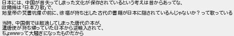 日本には中国が昔失ってしまった文化が保存されているという考えは昔からあってな 欧陽は日本刀歌で 始皇帝の焚書坑儒の前に徐福が持ち出した古代の書籍が日本に隠されているんじゃないか?って歌っている 当時中国側では散逸してしまった唐代の本が 遣唐使が持ち帰っていた日本から逆輸入されて ちょって大騒ぎになったものだから
