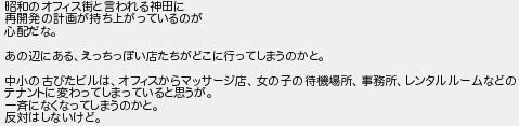 昭和のオフィス街と言われる神田に 再開発の計画が持ち上がっているのが 心配だな あの辺にあるえっちっぽい店たちがどこに行ってしまうのかと 中小の古びたビルはオフィスからマッサージ店女の子の待機場所事務所レンタルルームなどの テナントに変わってしまっていると思うが 一斉になくなってしまうのかと 反対はしないけど