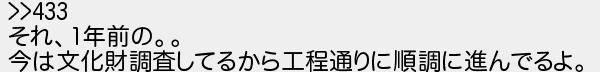 435: (空) [sage] 2018/01/12(金) 10:50:08.15 ID:CMq/1dRa >>433 それ、1年前の。。 今は文化財調査してるから工程通りに順調に進んでるよ。 http://egg.5ch.net/test/read.cgi/develop/1514891663/435