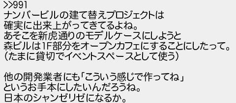 ナンバービルの建て替えプロジェクトは 確実に出来上がってきてるよね あそこを新虎通りのモデルケースにしようと 森ビルは部分をオープンカフェにすることにしたって たまに貸切でイベントスペースとして使う 他の開発業者にもこういう感じで作ってね というお手本にしたいんだろうね 日本のシャンゼリゼになるか