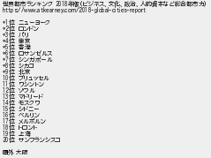 世界都市ランキング 年版ビジネス文化政治人的資本など総合都市力 位 ニューヨーク 位 ロンドン 位 パリ 位 東京 位 香港 位 ロサンゼルス 位 シンガポール 位 シカゴ 位 北京 位 ブリュッセル 位 ワシントン 位 ソウル 位 マドリード 位 モスクワ 位 シドニー 位 ベルリン 位 メルボルン 位 トロント 位 上海 位 サンフランシスコ 圏外 大阪