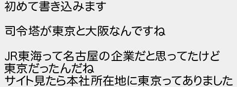 653: (SB-iPhone) [sage] 2019/05/31(金) 22:37:24 ID:4dpC+vak 初めて書き込みます 司令塔が東京と大阪なんですね JR東海って名古屋の企業だと思ってたけど 東京だったんだね サイト見たら本社所在地に東京ってありました http://egg.5ch.net/test/read.cgi/develop/1558699756/653