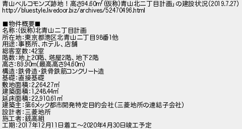青山ベルコモンズ跡地!高さ仮称青山北二丁目計画の建設状況 物件概要 名称仮称北青山二丁目計画 所在地東京都港区北青山二丁目番他 用途事務所ホテル店舗 総客室数室 階数地上階塔屋階地下階 高さ最高高さ 構造鉄骨造鉄骨鉄筋コンクリート造 基礎直接基礎 敷地面積 建築面積 延床面積 建築主第メック都市開発特定目的会社三菱地所の連結子会社 設計者三菱地所 施工者銭高組 工期年月日着工年月日竣工予定