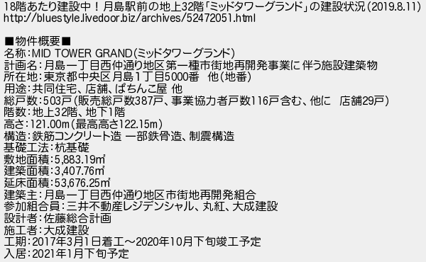 175: (東京都) [] 2019/10/26(土) 01:26:11.88 ID:6cdk6eJf 18階あたり建設中!月島駅前の地上32階「ミッドタワーグランド」の建設状況(2019.8.11) http://bluestyle.livedoor.biz/archives/52472051.html ■物件概要■ 名称:MID TOWER GRAND(ミッドタワーグランド) 計画名:月島一丁目西仲通り地区第一種市街地再開発事業に伴う施設建築物 所在地:東京都中央区月島1丁目5000番 他(地番) 用途:共同住宅、店舗、ぱちんこ屋 他 総戸数:503戸(販売総戸数387戸、事業協力者戸数116戸含む、他に 店舗29戸) 階数:地上32階、地下1階 高さ:121.00m(最高高さ122.15m) 構造:鉄筋コンクリート造 一部鉄骨造、制震構造 基礎工法:杭基礎 敷地面積:5,883.19u 建築面積:3,407.76u 延床面積:53,676.25u 建築主:月島一丁目西仲通り地区市街地再開発組合 参加組合員:三井不動産レジデンシャル、丸紅、大成建設 設計者:佐藤総合計画 施工者:大成建設 工期:2017年3月1日着工〜2020年10月下旬竣工予定 入居:2021年1月下旬予定 http://egg.5ch.net/test/read.cgi/develop/1572012721/175